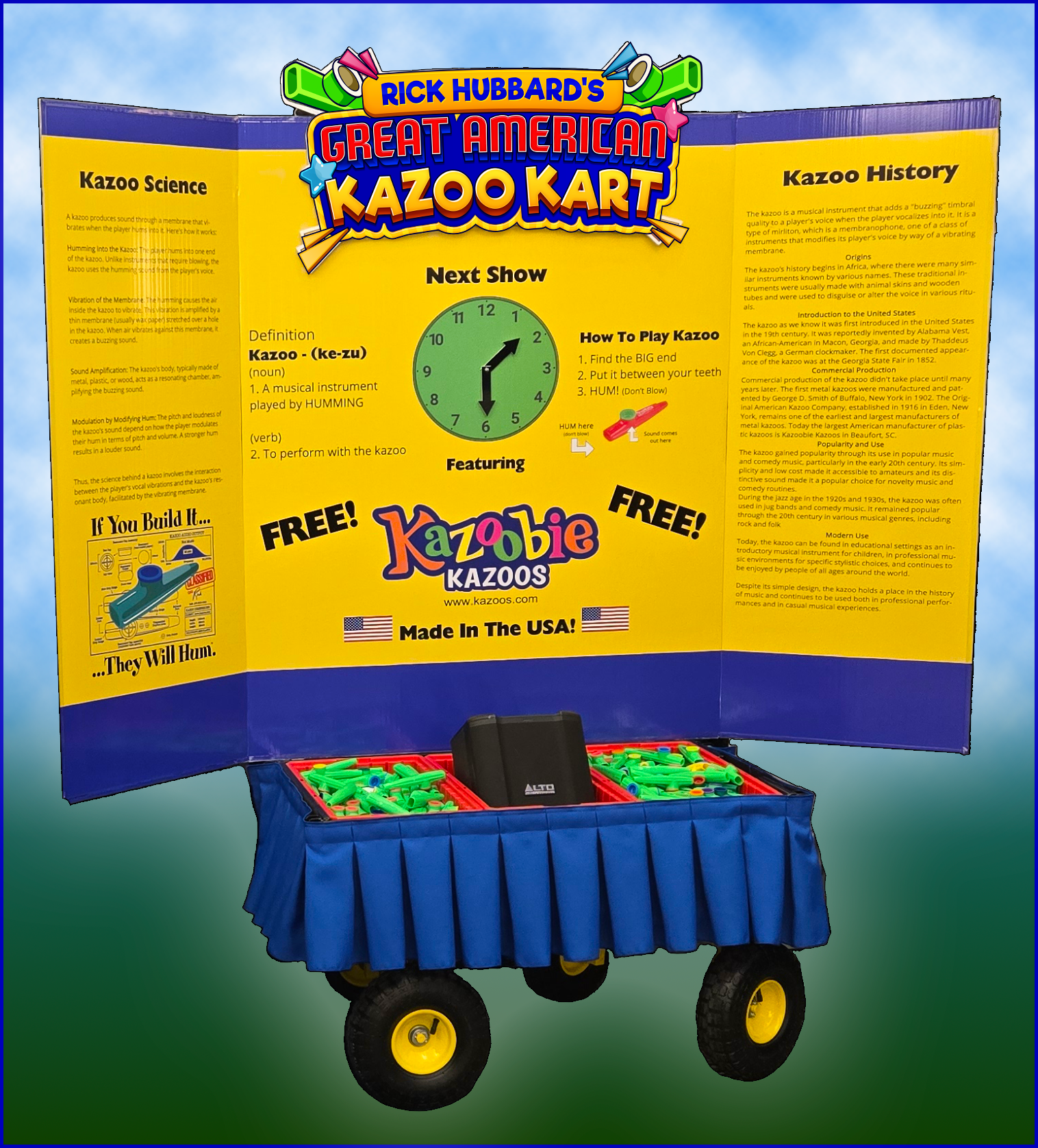 A Kazoo Show On WheelsRoving Or In Place10-Minute ShowsFREE Kazoos!Multiple Shows Per HourCompletely Self-ContainedAll Ages - Kids & AdultsPerfect for Festivals, Fairs, and Special Events